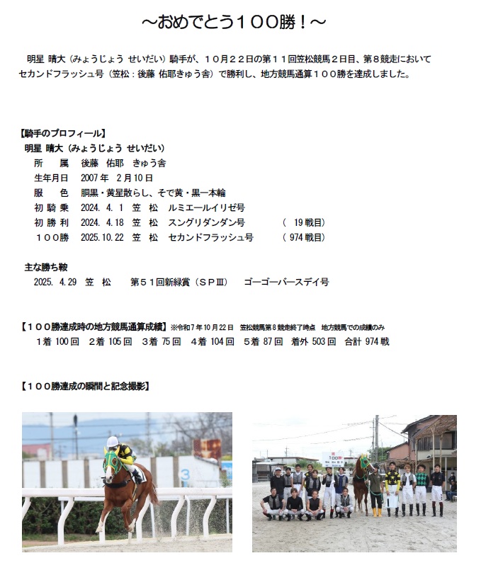 明星晴大騎手 地方競馬通算100勝達成のお知らせ