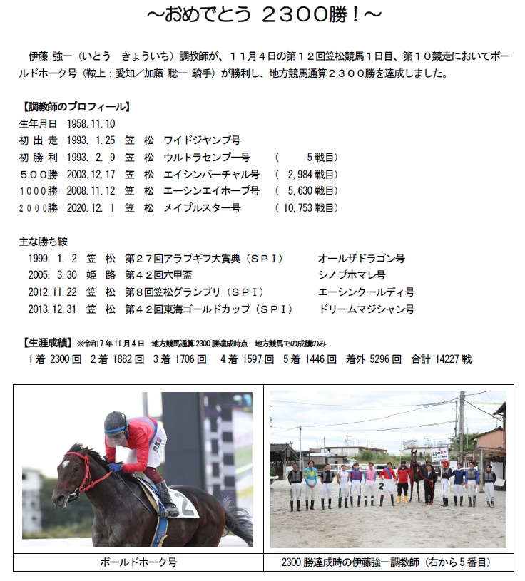 伊藤強一 調教師地方競馬通算2300勝のお知らせ