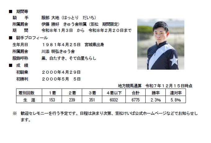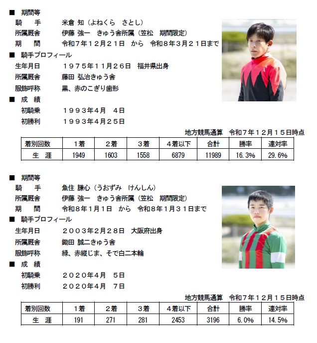 金沢競馬所属の米倉知 騎手、魚住謙心騎手、服部大地 騎手が、期間限定で笠松競馬場にて騎乗することになりましたので、お知らせいたします。