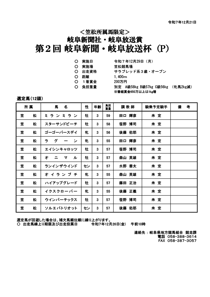 第2回 岐阜新聞・岐阜放送杯(P) 選定馬一覧