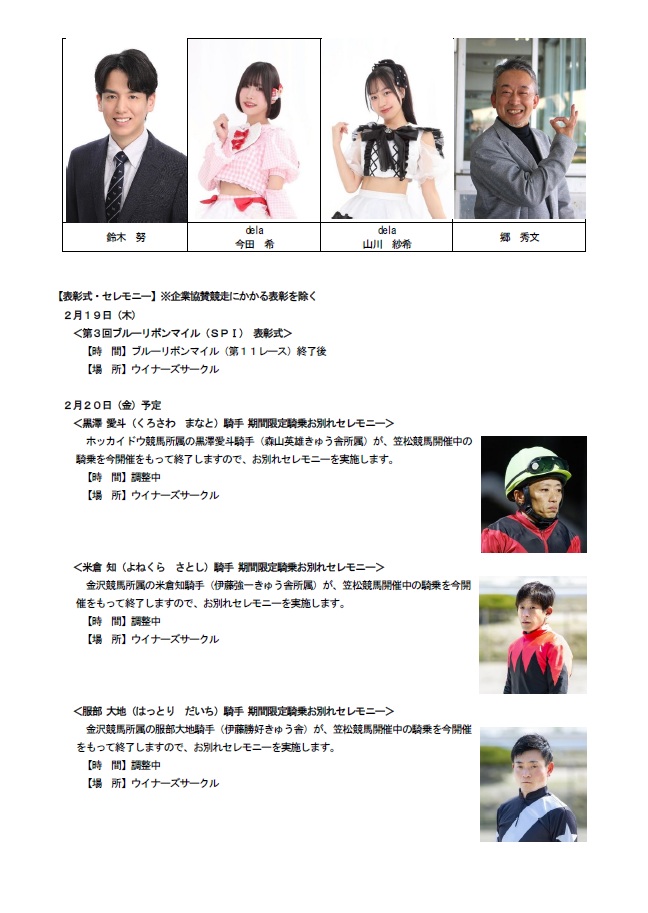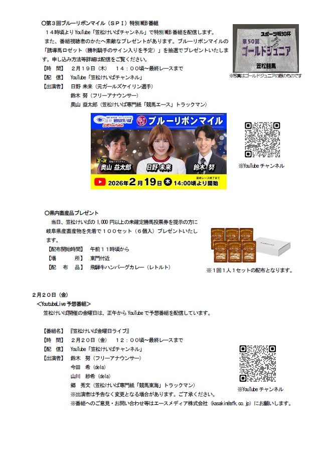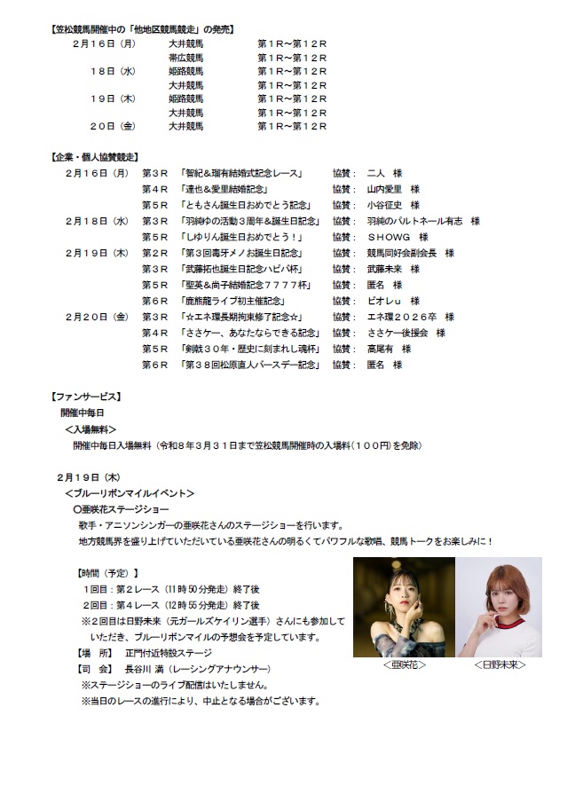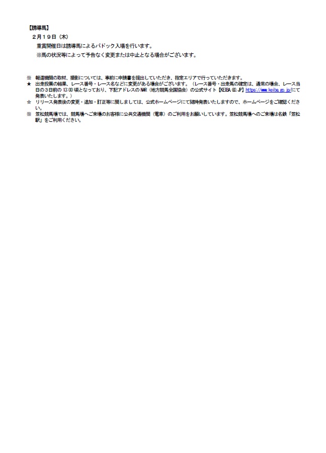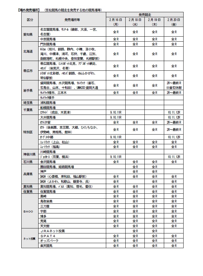 【第1競走発走時刻】 2月16日 11:10、18日 11:50、19日 11:20、20日 10:45